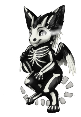Agatha was always the odd one out in the Quetzal Palace. Her feathers were too dark blue for a Blue Roan, her eyes too malicious. The other young Angel Dragons stayed away from her, and she was more than happy, she didn't want their scorn and teasing. But one day, Agatha met a beautiful young Palomino Angel Dragoness named Seraphine. Seraphine tore her way through Agatha's barriers around her desolate heart and quickly became Agatha's only friend. Before Agatha could realize what was happening she fell in love with beautiful Seraphine. Horrified and ashamed, Agatha avoided Seraphine and all the other young Angel Dragons for a whole month. When she finally deemed it safe enough to return, she was intercepted by Seraphine's young lover, Sammael. Sammael was pissed off, because he thought Agatha had returned to steal Seraphine from him. So he snatched her, chopped off her tail, and left her to die. Seraphine found Agatha, bleeding out onto the clouds, and cried over her dying friend. Seraphine's tears contained enough power to drive Agatha's spirit from her dying body. Before Seraphine's eyes floated a ghastly version of her dead friend. Her fur was inky black, with skeletal markings glowing white against the dark. Her white eyes glowed, and in place of her missing tail, was a tail made of bone. The last words Agatha said to Seraphine was the name of her killer before she was outcast from the purity of Quetzal Palace and sent to Dragonsmaw Manor, where she lurks, watching and waiting for Sammael to show his disgraceful face and challenge her to a final showdown to set her spirit free.
