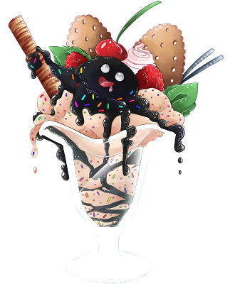 However, because of his mother's lack of craftsmanship and aptitude at the time, Parfait is a shifty who has difficulty assuming an anthropomorphic form. Rather than disguising his original form with transmogrification, Parfait is stuck decorating himself to appear more palatable. He has difficulty making friends, as the general response is either to shirk away in disgust, or to try and eat him: neither of which are appropriate responses. He is known only as "Parfait," as he spends most of his time in a parfait glass, where he feels the most cozy.