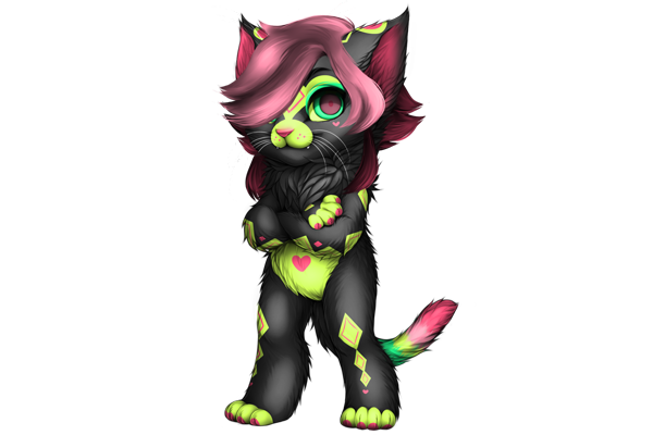 what gorgeous hair!! i also love her coloring. sometimes, neon colors can be a bit hard to pull off well in terms of going together but you nailed it! i love the diamond shaped patterns that reappear among-st her design and the hearts on her cheek and lower stomach~!