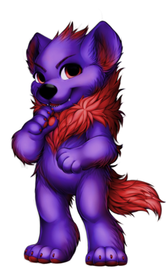 i love her colors~!! purple and red, when done right with the right shade (you pulled it off)--purple and red can be a wonderful color combination. hmm-- reminds me of a sunset, of some sorts; purple and red skies over the horizon. i also love, however simple, her markings! i like the tinge on the underside of her arms and the backs of her legs, her paws, the little flare of red on the top of her head... a h, everything!
