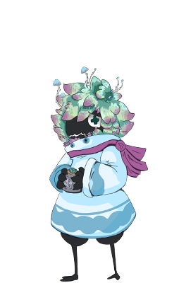 Russel likes flowers and grows small plants in thimbles and other small pot like things he finds. his mask is a common round one but to seem special he sometimes draws new designs on the face or attaches leaves or bits of trash to look like animals.