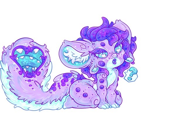 This Wemble, Squeke, is a particularly quizzical little creature, and can be expected to get into most anything if left unattended. They have particularly stunning bio-luminescent traits, that show themselves at their highest levels in their eyes, inner mouths (both Squeke, and it's tail, Embry), and inner ears. These sometimes manifest throughout their violet coloration in the form of small, aqua speckling that fluctuates in placement. This quality shines the brightest in the evening hours, particularly when Squeke is in high spirits.