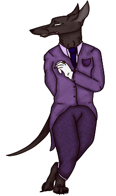 The torches lit up all at once, only enough to light up the surrounding area nearest to you. In front of you, no more than a few yards away, was a tall dog. A demon. You could not tell if it was furred, or if the disgusting black colors was its skin. It wore a fancy purple suit that seemed to writhe around him as the shadows danced over the demon. His paws were gloved in fine white silk, fingers decorated with gold and ruby rings. He held a cigarette in his mouth, small smile emotionless and filling you with unbridled terror. He had no eyes.
