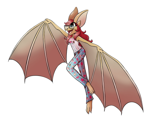 A fursona based on myself. Ash is a pallid bat who is ironically afraid of heights and tends to have somewhat poor hearing despite her large ears. Her ears are better at picking up certain frequencies rather than actually hearing a conversation. She is nocturnal yet afraid of the dark, usually keeping a night light on somewhere if the room is too dark. She is very near sighted and prefers wearing glasses since contacts irritate her eyes. Despite her big clumsy wings, she is very good at playing video games and enjoys to draw, though, her wings to make her rather clumsy and she tends to trip over them often. She has severe social anxiety and will have a panic attack over a simple phone call or being put in a situation where she is alone in a crowd. She will attach to one person she knows if she is alone in a strange place. She has trouble making friends since when she meets someone new she panics and tends to let words spill from her mouth without filter.