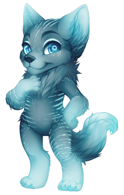 A handsome dark blue wolf stares at you, his smile much warmer than the cool tones of his fur. His fur has an odd glow to it, with blue glowing stripes. His blue eyes match the rest of him, and sparkle with knowing. You almost feel like he's looking right through you, it sends shivers down your spine.