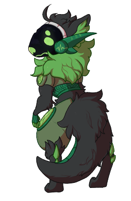 Like the other members of his squadron, SM-1193-08 is primarily based around green colors, made to match the dense foliage of the planet they were sent to conquer. A dark, almost mossy green is the primary shade for his armor, while lighter green accents and digital enhancements mark his visor, fin blades, and smaller parts of his armor. His visor is shaped slightly around the muzzle, but remains rather smooth whilst his fin blades jut out razor sharp. The biological parts of his body is covered in a dark, nearly black fur. Occasionally, he may be seen wearing a red and white cross patch upon the front upper right half of his torso armor. He has a stray tuft of hair near the very top of his visor that refuses to stay down, and he has given up on trying to tame it long ago.