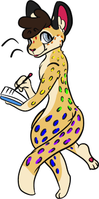 You wave and say hi, and the cheetah stops writing to look up at you, startled. She can't be anything else, with her spots and distinctive muzzle markings, even though said spots are quite unusual. The inside of her spots are in a rainbow gradient rather than the golden tan of her fur, and patterned as if she walked on all fours rather than the bipedal her actions suggest. Maybe she does both?