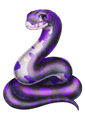 Miia, as a hognose snake, can be quite a dramatic little girl. She is extremely emotional and expressive for a snake. She lived with Vereah even long before they had to leave their old home. As such, Miia being hatched with black scales and blue eyes has destined her to be chaotic yet very loyal, kind, and fun loving. Her maturity markings as purple indicate that she is wise, but unlike Vereah, will very rarely let it be known to those who dont know of their old land's laws. She is much more obviously hedonistic, however.