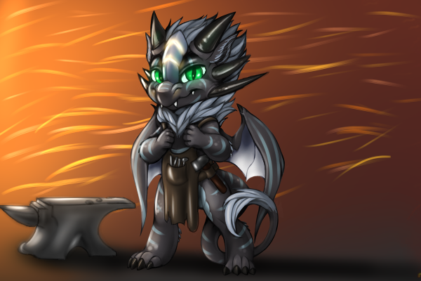 He himself is a calm, friendly dragon, if not a little short tempered like his father. This temper works wonders when you need to strike a particularly stubborn piece of metal into shape. Sometimes ridiculed for his rather peculiar name, he still carries it with pride. And if someone is too obnoxious with their insults, he can always breathe fire on them (short temper!!!)! Another notable feature is his somewhat odd sense of humor and the urge to tell bad jokes, usually ones he has already told before. To top it off, he always laughs at his jokes, no matter how bad they are. None can question his skill at the forge, however, as he is already capable of making the most keenest and toughest of weapons and armor there is, being one of the most prestigious blacksmiths in the Dragonsmaw manor.