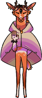 A salt of the earth dude who just likes to help people. He's a big goofball who is way to trusting of others. Something in his past made him unable to regrow antlers, so he wears a crown of them instead. His third eye is a mystery, although it seems Dubu knows something about it.