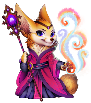 Absolutely beautiful lil fox! c: I love everything about this, especially the golden fur with the purples and reds of the magic and objects.