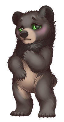 Teddy, the big buff black bear, who's a huge softie. He's shy and self conscious and has a huge crush on Oriel, though is too shy to make a move just yet. In the mean time, he crafts her amazing weapons and armor.